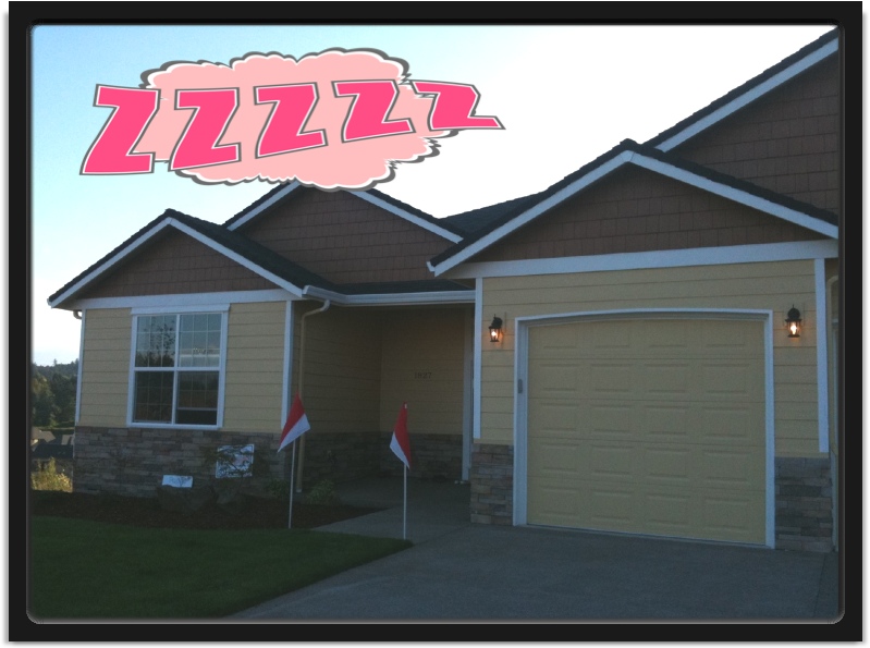 The write-up speaks of the home being located in the "prestigious West Meadow Estates" but somehow I missed the whole "prestigious" bit. Maybe the setting sun was glaring too brightly in my eyes or something. My caption on the photo pretty much says it all. There is another section to the garage - no worries - I was just trying to get out of the glare when I took the picture and chopped it off. You are not missing much. The door on that section looks exactly like the door in the section I pictured above. Whew!