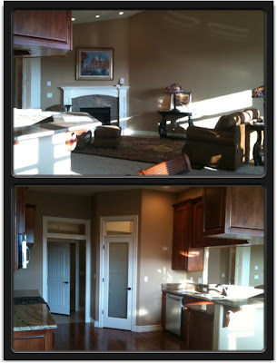 The home had a kitchen, a living room, and a bunch of bedrooms...that's all I remember. The one thing I did really like about this house were the wood floors. They were laminate, I'm sure, but it was a pretty mahogany color and did not have any of the rough-hewn, wavy look that has been so popular in new homes for the past few years. You can see a bit of the floor in the pictures. Note the taupe walls with white moldings. They must have been given a really good deal on those two colors because they were used exclusively throughout. While we are looking at the kitchen, I might mention there were no food give-aways. That may also add to my dislike of this home. Except the flooring, of course.