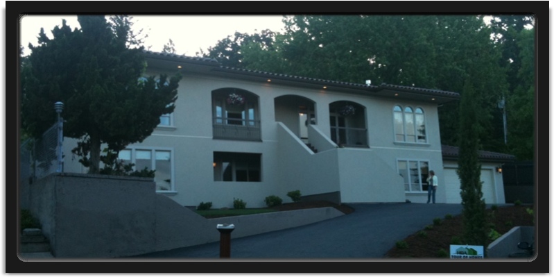 So, minus a few quirks, this house was by far the best of my small portion of the home tour. It would comfortably hold a large family inside, but I think the main downside is the lack of space outside (well, unless you want to stand in the barkdust and stare at the odd inset-thingie). I'm sure that would be a big hit for kids. Another thing...here you have almost a million dollar house, but all of your neighbors...uhhh...don't. You have beautiful, dark woods, lush carpets, carefully crafted stone, and your next door neighbor has.....
